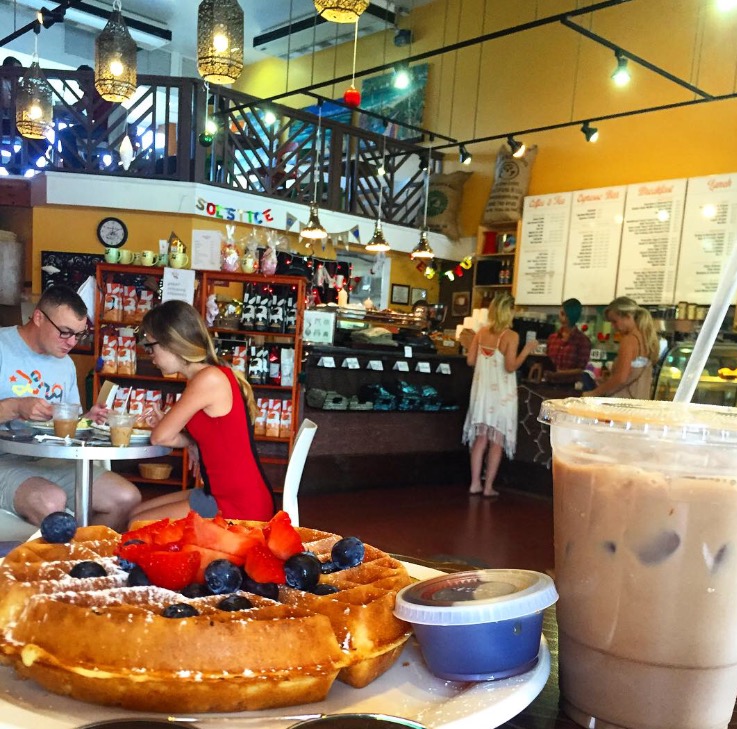 - Morning Brew in Kailua – This “funky, bohemian-style coffeehouse” is located in the same strip mall as Lanikai Juice (yum) and in the popular town of Kailua. Morning Brew is an awesome coffee shop that I highly recommend to anyone that has a morning or afternoon in Kailua. Strong wifi, breakfast and lunch options, and all the coffee, tea and espresso you dream of. There are multiple areas to sit (upstairs, downstairs, and a few tables outside), so bring a few friends or come alone. I ordered the “Funky Monkey” (a chocolate + banana latte), which is technically discontinued on their menu but you can still order it. I also got the Belgian style waffles with seasonal fruit. Need I say more?